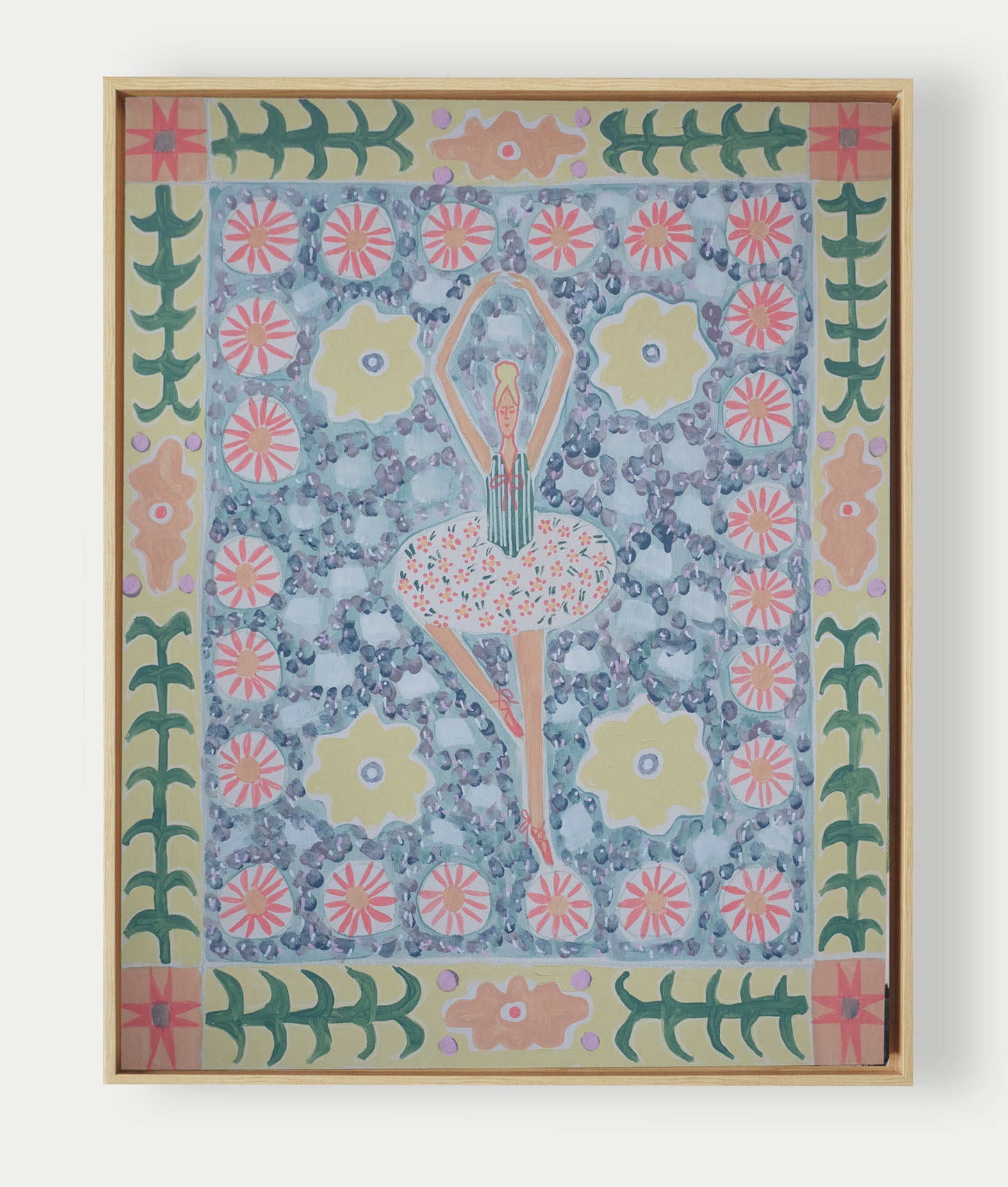 This painting is offered with the option to frame in a natural wood floater frame.