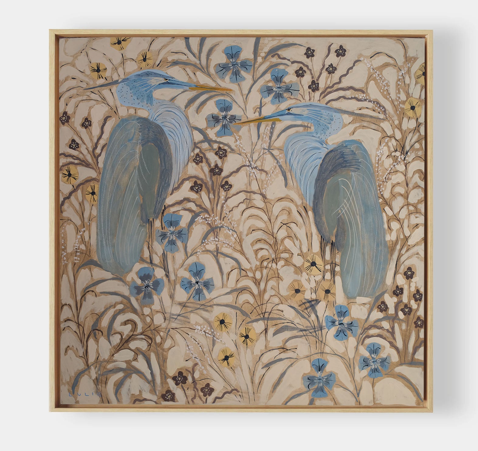 This painting is offered with the option to frame in a natural wood floater frame. If purchased unframed, the sides of the panel are painted white, with hanging hardware attached, and is ready to hang.