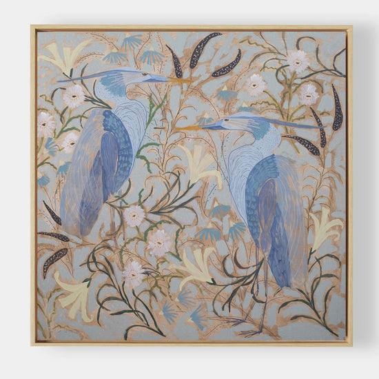 This painting is offered with the option to frame in a natural wood floater frame. If purchased unframed, the sides of the panel are painted white, with hanging hardware attached, and is ready to hang.