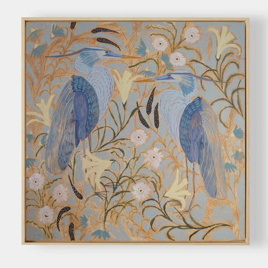 This painting is offered with the option to frame in a natural wood floater frame. If purchased unframed, the sides of the panel are painted white, with hanging hardware attached, and is ready to hang.