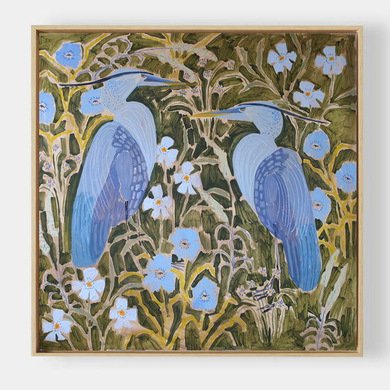 This painting is offered with the option to frame in a natural wood floater frame. If purchased unframed, the sides of the panel are painted white, with hanging hardware attached, and is ready to hang.