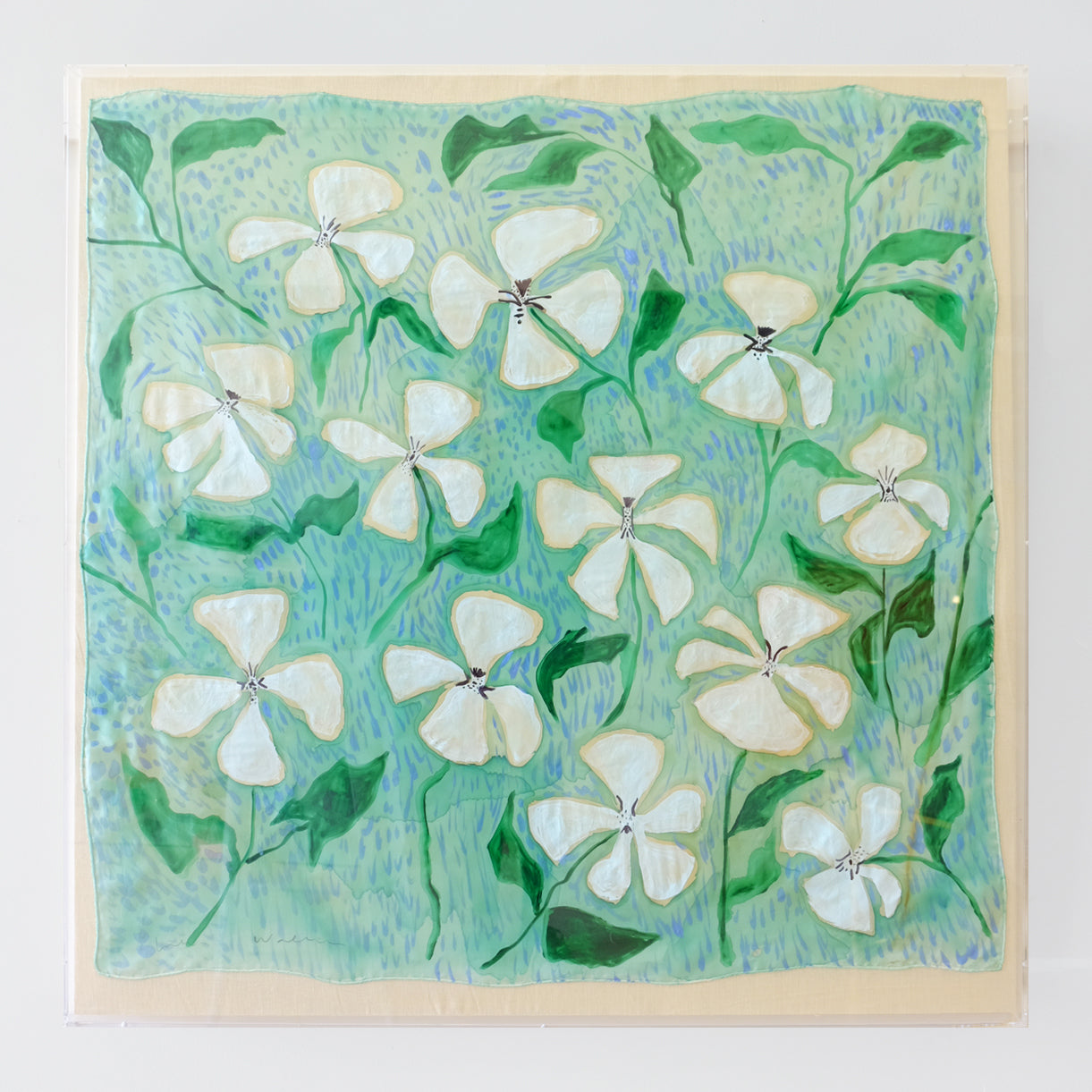 This work is an original painting on silk that is hand sewn on linen and framed in a recessed acrylic box frame. The finished framed size for this piece is 36 x 36", and the price includes shipping within the US. Each framed silk comes signed and ready to hang.