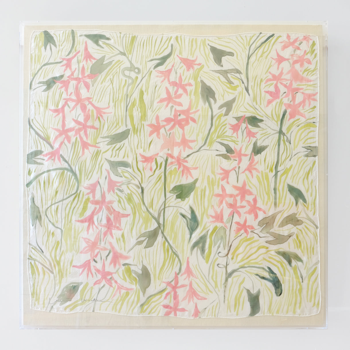 This work is an original painting on silk that is hand sewn on linen and framed in a recessed acrylic box frame. The finished framed size for this piece is 36 x 36", and the price includes shipping within the US. Each framed silk comes signed and ready to hang.