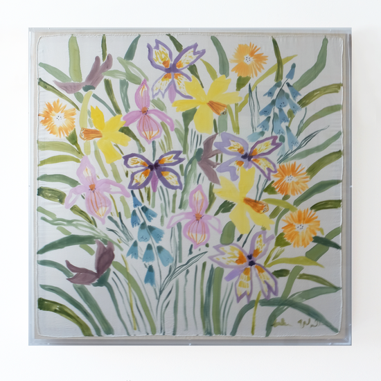 This work is an original painting on silk that is hand sewn on linen and framed in a recessed acrylic box frame. The finished framed size for this piece is 36 x 36", and the price includes shipping within the US. Each framed silk comes signed and ready to hang.