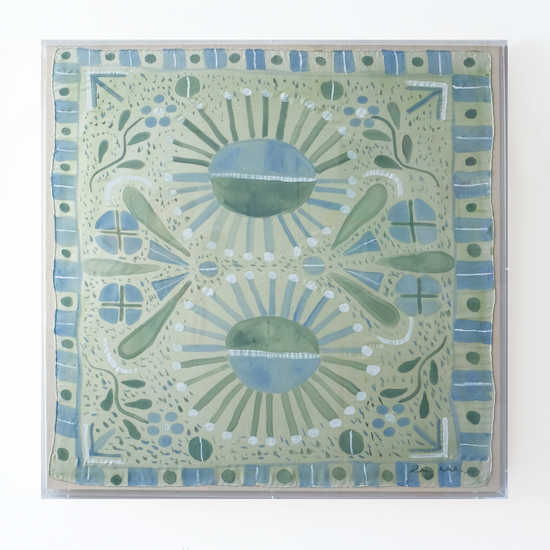 This work is an original painting on silk that is hand sewn on linen and framed in a recessed acrylic box frame. The finished framed size for this piece is 36 x 36", and the price includes shipping within the US. Each framed silk comes signed and ready to hang.