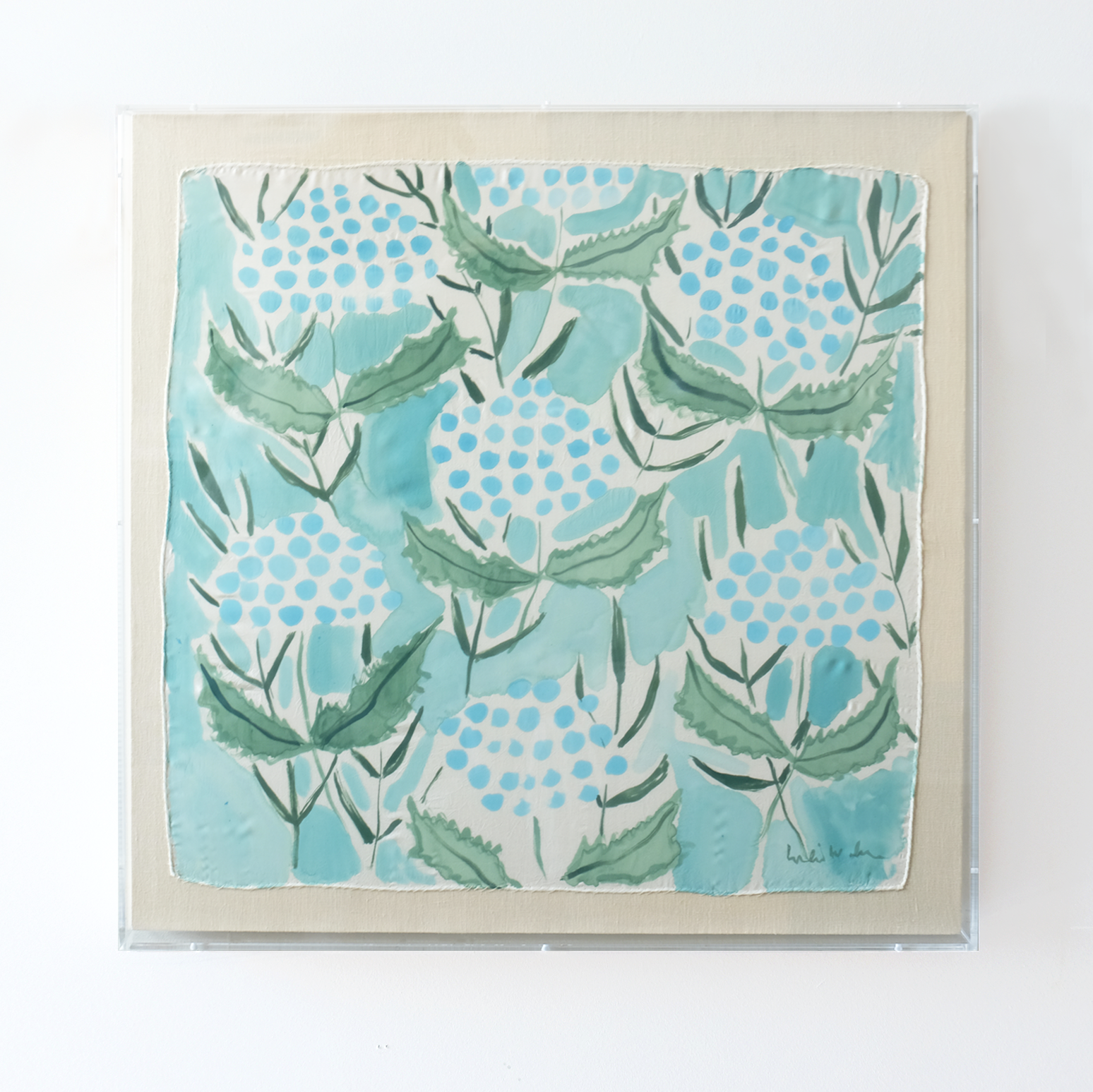 This work is an original painting on silk that is hand sewn on linen and framed in a recessed acrylic box frame. The finished framed size for this piece is 24 x 24" and the price includes shipping within the US. Each framed silk comes signed and ready to hang.