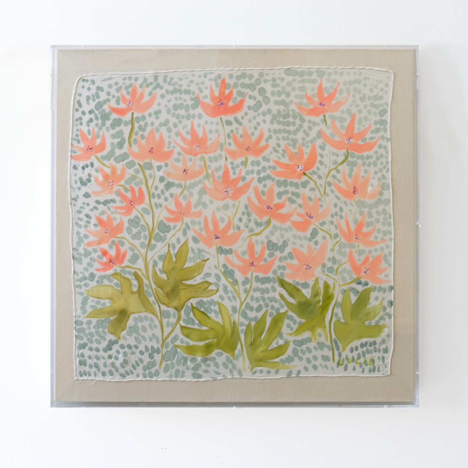 This work is an original painting on silk that is hand sewn on linen and framed in a recessed acrylic box frame. The finished framed size for this piece is 24 x 24" and the price includes shipping within the US. Each framed silk comes signed and ready to hang.