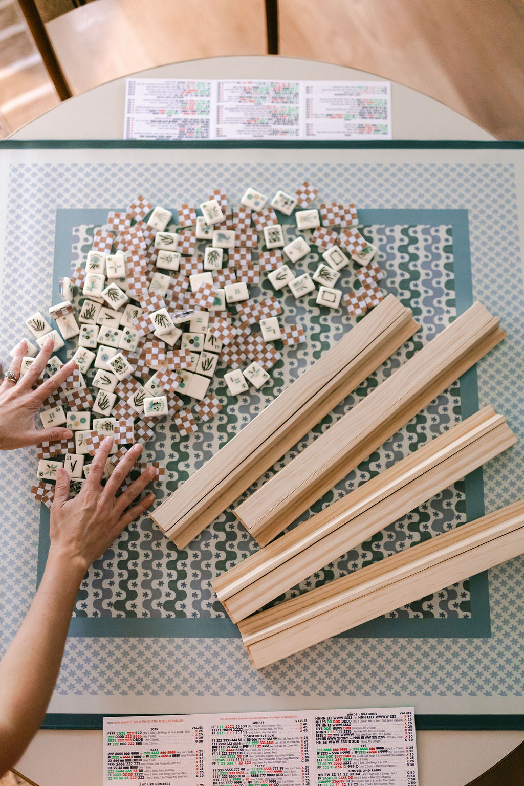 Crafted from durable acrylic, each tile showcases a printed burl wood checkerboard image on the back, complemented by natural palette—sage greens, deep browns, ocean blues, and soft ivory. The complete set includes 160 standard tiles—Dots, Bams, Craks, Winds, Dragons, Flowers, and Jokers.